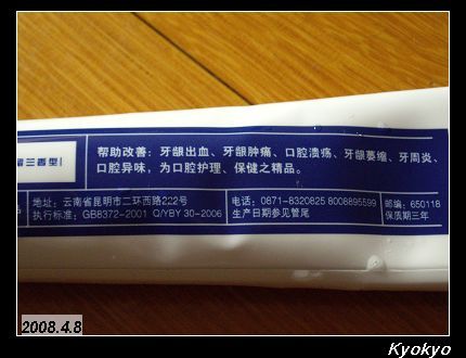 就我所認識的雲南白藥是類似西瓜霜一樣的東西吧!用來噴傷口治療用的,不過有做牙膏對我來說事件很稀奇的東西呢!但是,我家家長到底是從哪邊買到這種怪東西啊?晚上回到家後,詢問剛吃飽飯正在納涼的老媽,「老媽,廁所裡的牙膏到底從哪邊買來的啊?」,「上次去大陸昆明買來的」,我就知道。不過,隨著新聞老是在報物價上漲之際,買到這樣便宜的雲南白藥牙膏,也算是另類的幸運嗎?