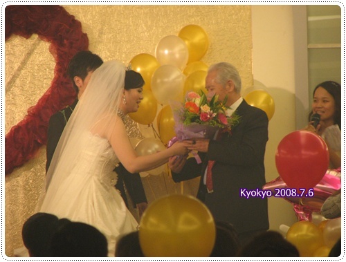 新娘換到第三套禮服時,跟著新郎帶著一手的玫瑰花出場,新人夫妻忙著分送玫瑰花,也代表著分送幸福給大家,不過,客人們果然很激動,一窩而上,差點讓新娘無法招架。