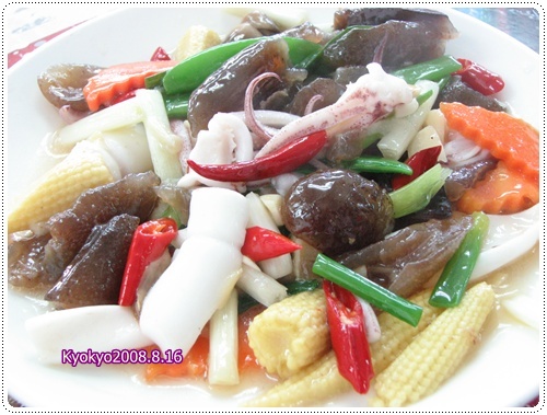 海鮮總匯,有花枝也有海蔘,不會煮得很油很黏,用著比較爽口的炒法來烹煮,因為裡面還放了點小玉米、紅蘿蔔等配菜,看起來更加開胃。