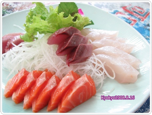 生魚片,其實在台灣的生魚片原則上我都不敢吃,雖然魚產可能很新鮮,但是因為台灣在處理生魚片上的乾淨度仍讓我很詬病,所以在外遊玩,原則上竟量都不會點生魚片,當時忘記叫店家換菜,真是一個失誤。