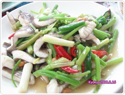 炒鯊魚肉,好吃耶~一般都會上鯊魚醃,不過新鮮快炒卻有另外一番風味,和大量的芹菜一起開炒,夾上芹菜和鯊魚肉一塊食用,兩者的味道互相在口腔內融合,美妙。醬料上應該也有放些豆矢之類的甜醬,鹹鹹甜甜的互相中和著,也很好吃呢!
