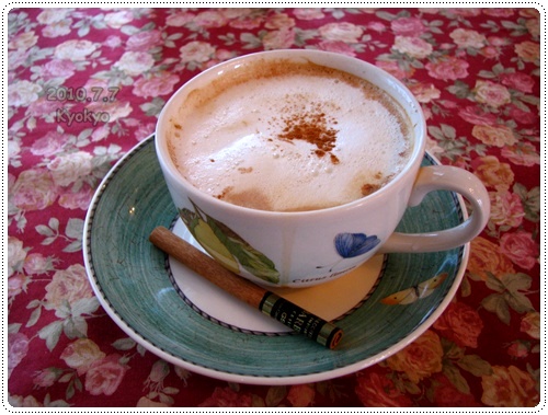 一心只想著拍照,完全忘記甜點已經上桌了,喫茶區的服務生急忙地來到我身邊,提醒我肉桂奶茶已經上桌,心想說肉桂奶茶不就一杯直接全部調味好,為什麼服務生一直很著急地要我趕緊回座位上,一看到桌上的肉桂奶茶,有點傻眼,因為竟然是像鉛筆一樣粗的肉桂棒擺在奶茶旁,難道奶茶的肉桂味要自己調嗎?服務生就在一旁開始解說製作方式,趁著奶茶還熱,將肉桂棒放進奶茶攪拌,依自己口味調成喜好的肉桂奶茶,喔~真是生平頭一遭看到肉桂奶茶是這樣做,有時候看到朋友點肉桂咖啡,也不過是咖啡裡灑上肉桂粉罷了,這樣的做法還真是稀奇。