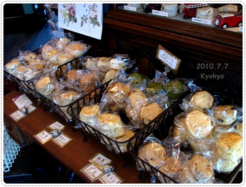 這就是我稍早前說的司康,據說也算是蛋糕的一種,只是口感比較樸實也比較札實,店家怕單吃會很單調,所以還附上四種風味的沾醬給我們。醬料分別是鹹奶油(就一般抹麵包吃的那種)、鮮奶油(蛋糕的奶油,超搭)、橘子醬、草莓醬,而司康的部分我們選擇店家推薦的紅豆和我想吃的抹茶,不知道為什麼,來到關西一帶總是很想吃抹茶商品呢!