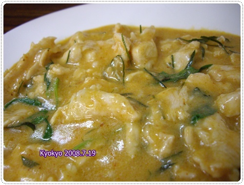 椰汁雞,剛端上來時還以為是綠咖哩雞呢!顏色還真像,椰汁可能有混合太白粉之類,所以看起來比較像有勾芡的樣子,雞肉和九層塔相炒,味道更佳厚重,用著湯匙連肉連湯舀進白飯裡,超級下飯的啦!這道菜真的可以單獨作成蓋飯呢!應該也不錯吃吧!和親子蓋飯有得拼囉~