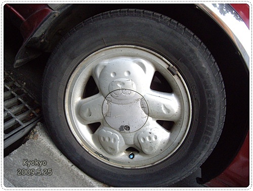 答案就是「車輪框」,有沒有很可愛,對愛小熊一族的人來說,有沒有被煞到啊!很可愛喔~熊耶!怎麼不會動心啊!輪框從中心點放射後大概都是五支幾何圖,第一次看到有這麼可愛的輪框,真想留個紙條給車主說:「你的輪框哪裡買的啊?」,真是可愛到不行呢~那你有沒有猜對啊?